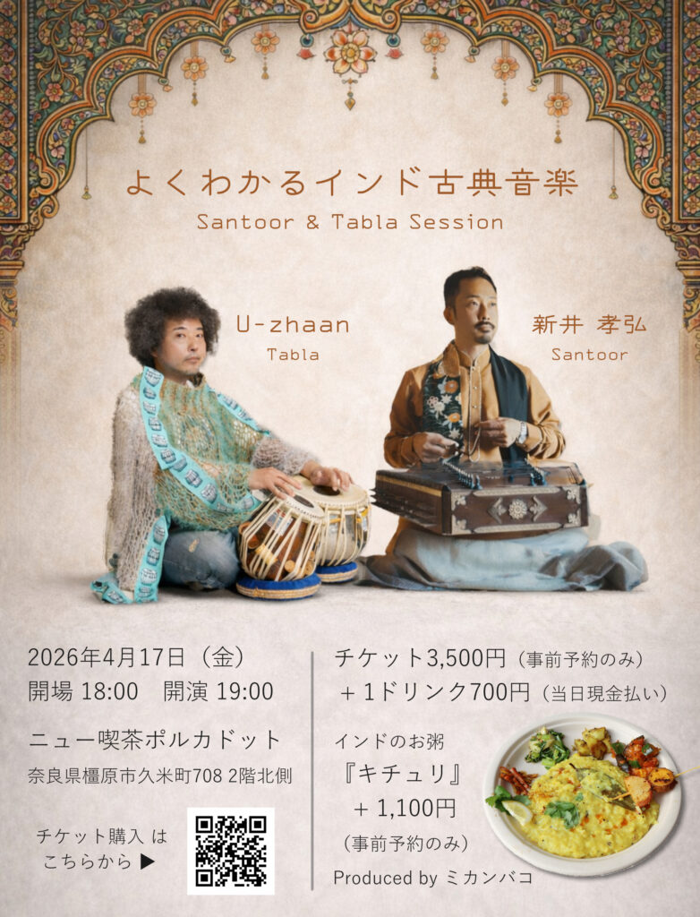 こんにちは、アジアン食器専門店サラヤシキの藤井です!今日は2026年4月17日に奈良県橿原市で開催されるインド古典音楽ライブ『よくわかるインド音楽』U-zhaan(ユザーン)×新井孝弘によるタブラ&サントゥールセッションをご紹介いたします!