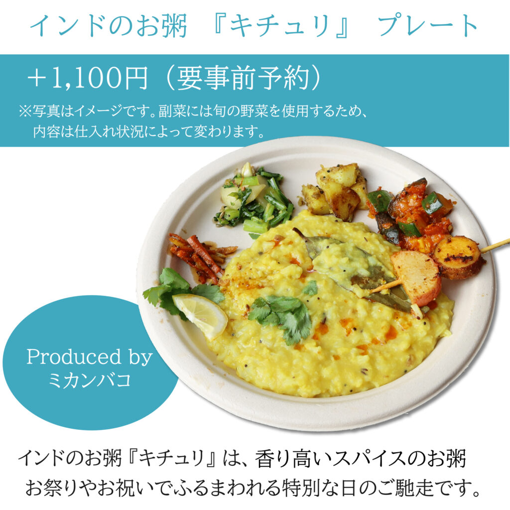 せっかく本場のインド音楽が聴ける機会なので、どうせなら本場のインド料理も味わってもらおう!そんな想いから、昨年惜しまれつつも閉店した大阪の人気店カフェミカンバコが一夜限りの復活!香り高いスパイスが食欲をそそるヘルシーなお粥キチュリは、インドではお祭りやお祝ごとの日にふるまわれる特別なご馳走です。